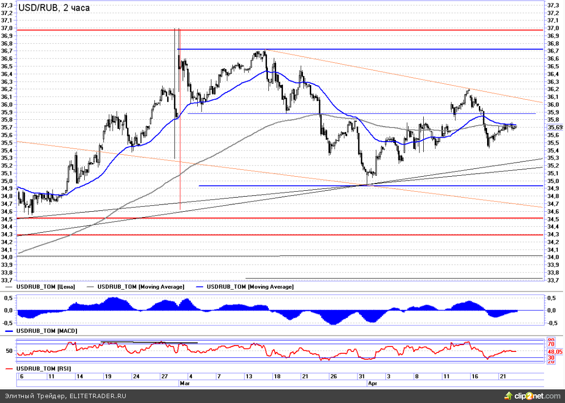 Ситуация с российским рублем во вторник оставалась стабильной. Котировки пары USD/RUB консолидировались в районе 35,60-35,70. Свою позицию по поводу дальнейшего развития событий не меняю. По-прежнему выделяется ближайший уровень поддержки на 35,10-35,20. Он отделяет нас от продолжения укрепления рубля вплоть до расчетных целей на 34,30-34,50. Ну а в качестве реперной точки, которая отделяет нас от новых максимумов по доллару, выделяем верхний экстремум прошлой недели на 36,20-36,25.