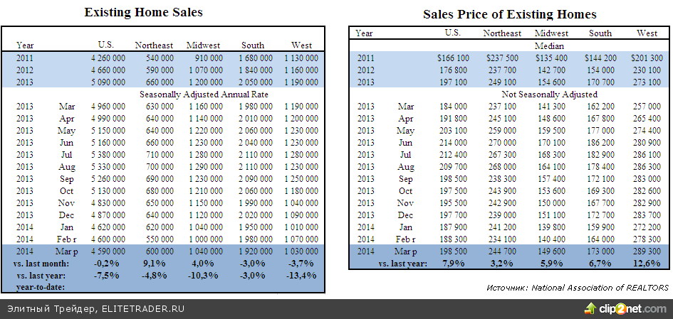 Среди обнародованной вчера статистики отметим данные по продажам домов на вторичном рынке. По данным Национальной ассоциации риелторов продажи в марте почти не изменились, тогда как рост цен на жилье был умеренным. Аналитики ожидали снижения с 4,6 млн. до 4,55, но оно оказалось гораздо скромнее до 4,59 млн.