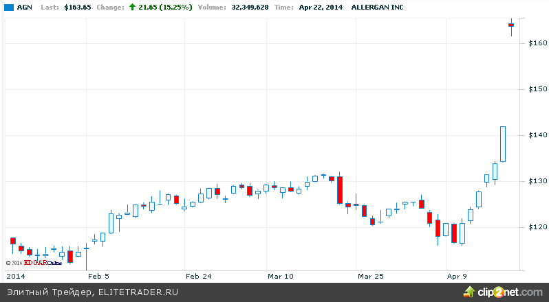 Предложение предполагает оплату одной акции на уровне $48,30 наличными, и 0,83 обыкновенными акциями Valeant, то есть оценивая Allergan в $152,88 за акцию, что составляло премию порядка 7% к цене закрытия в понедельник. Но бумаги выросли более чем на 15%. Нужно сказать, что это не удивительно притом, что собственно акции Valeant вчера подорожали на 7,5%.
