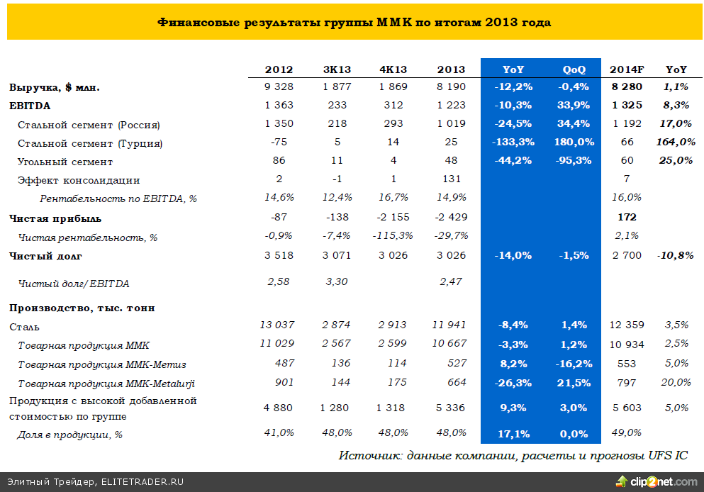 Подразделение MMK-Metalurji продолжило наращивать EBITDA (рост на 180% по итогам 4К13), EBITDA в стальном сегменте прибавила 34,4%;