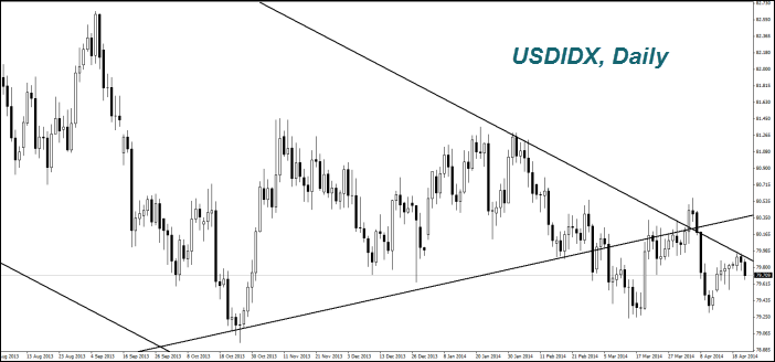 Индекс доллара США (USDIDX) вчера понизился и эта же тенденция продолжается сегодня утром. В марте продажи домов на американском вторичном рынке недвижимости оказались минимальными за полтора года и на 7,5% меньше, чем в марте 2013 года. Отметим, что участники рынка ожидали еще более слабых показателей из-за экстремально холодной погоды во время зимнего периода. Мы полагаем, что негативное влияние снижения продаж вторичной недвижимости будет ограниченным, так как, во-первых, они составляют небольшую часть ВВП. Кроме того, средняя цена домов по сравнению с прошлым годом увеличилась на 7,9% и находится на шестимесячном максимуме. Таким образом, объем продаж в денежном выражении сохранился примерно на прошлогоднем уровне. Сегодня в США в 15-00 СЕТ выйдут данные по первичному рынку недвижимости за март. В 14-45 СЕТ агентство Markit представит уточненный индекс производственной активности (PMI) за апрель. По нашему мнению, предварительные прогнозы являются позитивными для индекса доллара.