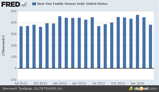 По данным бюро Минторга США продажи новых односемейных домов упали до самого низкого уровня за последние восемь месяцев, сократившись на 14,5% в марте, и составив в годовом выражении 384 тыс. Февральские данные были пересмотрены до 449 тыс. с 440 тыс. Консенсус прогноз аналитиков предполагал рост до 450 тыс. в марте. Медианная цена при этом выросла на 12,6% в годовом выражении до $290 тыс. При этом глядя на динамику продаж по регионам, ряд аналитиков, говорят о том, что подобные негативные явления могут быть чем-то большим, чем отражением суровой погоды прошедшей зимой.