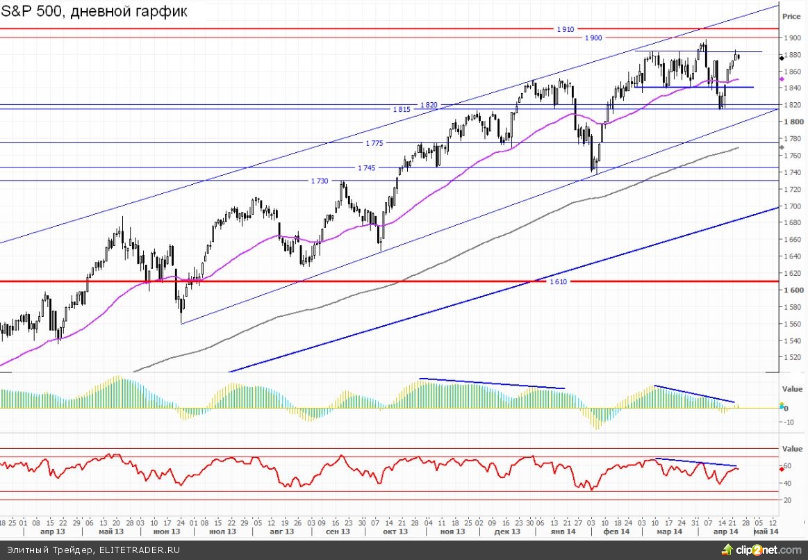 В данный момент фьючерсный контракт на SnP 500 торгуется с повышением на 0,01% около отметки 1874. Это отчасти происходит на фоне сегодняшних ожиданий сильного роста акций компании-флагмана Apple, имеющих самый большой вес в индексе. Вышла позитивная отчетность, а также был объявлен рост программы обратного выкупа. На мой взгляд, сегодня существует высокая вероятность обновления локального максимума и движение индекса в сторону 1900.