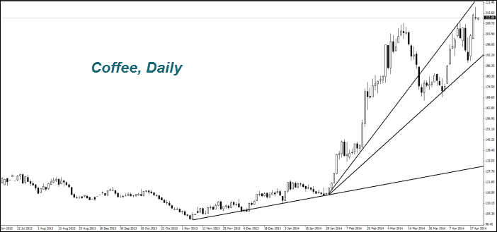 Стоимость кофе (Coffee) вчера обновила двухлетний максимум из-за засухи в Бразилии. По прогнозу швейцарской компании Volcafe, урожай в Бразилии, в сезоне 2014/2015 годов составит всего 45,5 млн. мешков (60 кг) или 2,73 млн. тонн. Из-за этого на мировом рынке впервые за последние пять лет может образоваться дефицит в размере 11 млн. мешков. Мы не исключаем технической коррекции, после бурного роста мировых цен на кофе — почти в два раза за последние полгода. Мировые запасы кофе составляют порядка 9,7 млн. тонн. Они могут частично скомпенсировать снижение урожая в текущем году. Да и погода в Бразилии ещё может улучшиться. Отметим, что рост цен на кофе стал неожиданностью для участников рынка. По данным американской Комиссии по торговле товарными фьючерсами, чистая совокупная позиция на покупку (net-long position) сформировалась на рынке лишь в феврале, а до этого 18 месяцев подряд наблюдалась чистая позиция на продажу.