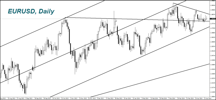 Завтра ночью в 1-30 СЕТ в Японии выйдут важные экономические показатели инфляции за март. В принципе, предварительные прогнозы свидетельствуют в пользу укрепления японской иены (на графике USDJPY это выглядит как снижение), но точную реакцию рынка предсказать сложно. Напомним, что Банк Японии собирался прекратить стимулирование экономики когда инфляция в целом по стране поднимется до 2%. Ожидается, что в марте она может достигнуть пятилетнего максимума и составить 1,4%. Следует обратить внимание на стержневой индекс потребительских цен в Токио за апрель. Он часто предваряет инфляцию по всей стране, которая выйдет в мае. По прогнозам, этот токийский индекс может завтра возрасти на 2,8% год к году, что является максимумом с 1992 года. Он выходит впервые после повышения налога с продаж в Японии.