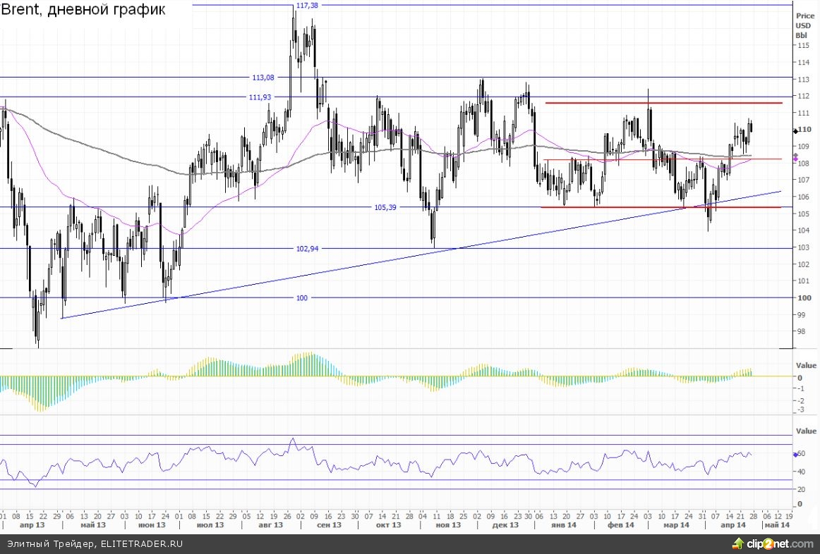 Несмотря на то, что в Женеве в рамках четырехсторонних переговоров (США, ЕС, Украина, Россия) начал появляться более-менее конструктивный диалог, украинская премия из цены не исчезла. Договоренности не выполняются. Котировки Brent продолжают находиться в пределах восходящей фазы. Действующий президент Турчинов накануне поставил под сомнение женевские соглашения, призвав правительственные войска возобновить давление на пророссийских сепаратистов в восточной части страны. Вчера в Славянске произошло столкновение между правительственными войсками и силами ополчения (самообороны). Есть реальные жертвы и сейчас понятен общий формат действий, к которому решили прибегнуть в Киеве. В данный момент ситуация немного успокоилась, однако Турчинов уже заявил, что антитеррористическая операция на востоке страны будет продолжена, даже несмотря на начавшиеся военные учения российских войск на приграничных территориях.