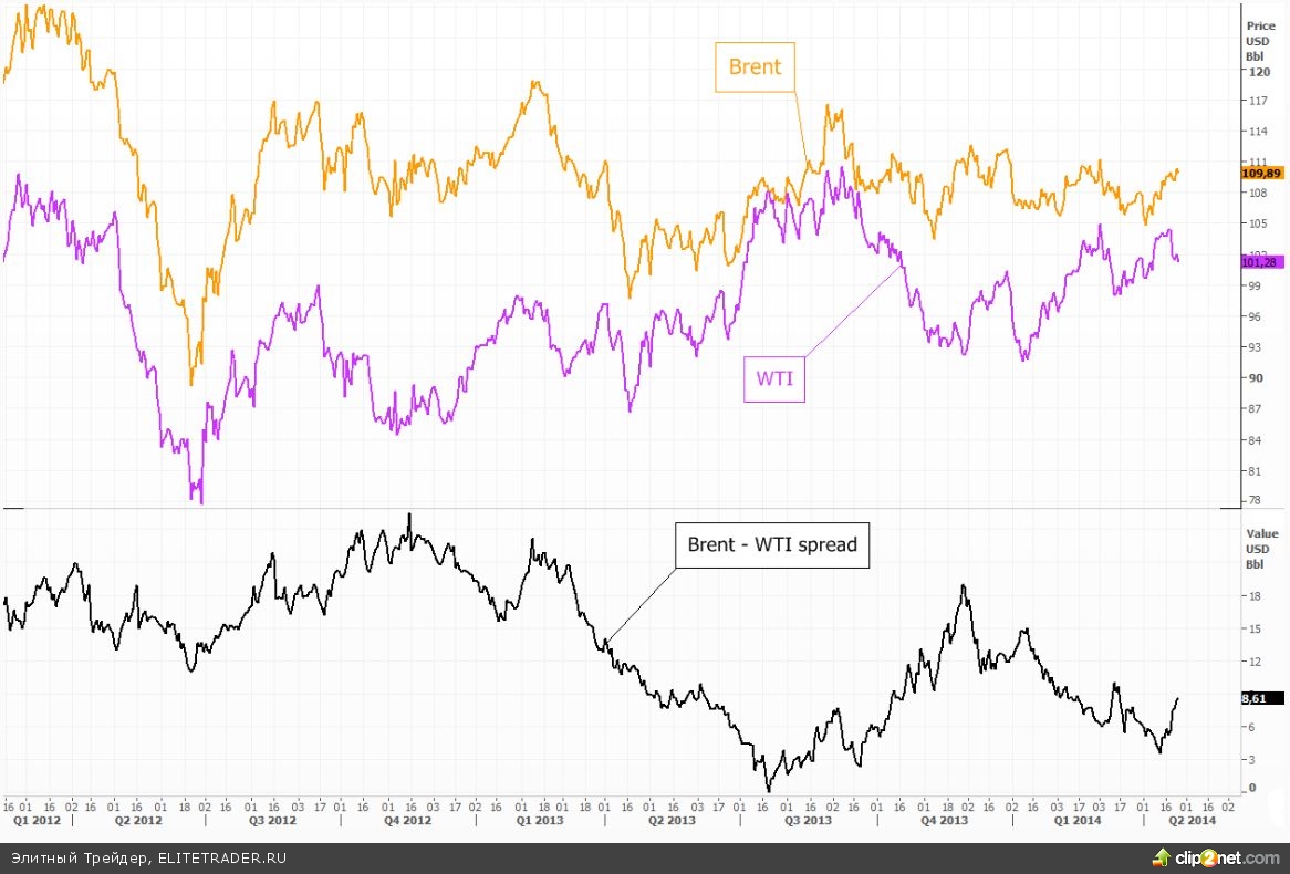 На конец недели июньские нефтяные фьючерсы марки Brent находятся вблизи отметки в $109,9. С прошлой пятницы они выросли на 0,4%, стоимость WTI понизилась до $101,3, опустившись на 1,7%. Спрэд между марками увеличился и в данный момент составляет около $8,6.