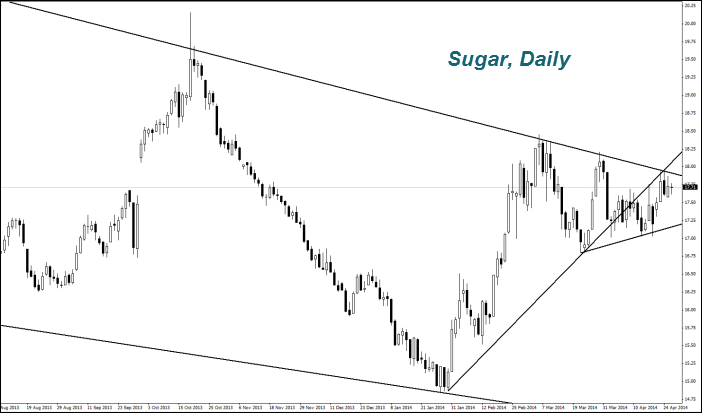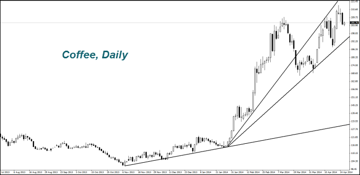 Стоимость сахара (Sugar) слегка повысилась. Бразильская компания Unica понизила прогноз урожая сахарного тростника из-за засухи на 5% до 32,5 млн. тонн. Мы не исключаем роста волатильности фьючерсов на сахар из-за погашения ближайшего майского контракта на Межконтинентальной бирже (ICE) на следующей неделе. В нём много открытых позиций.