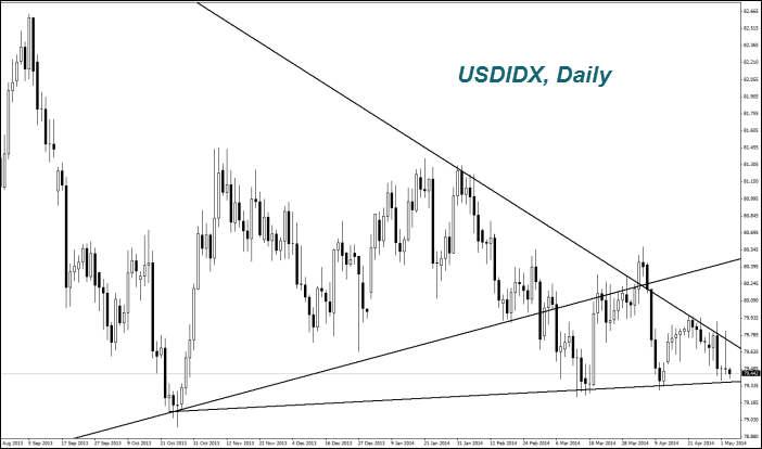 Безработица в апреле сократилась до минимума за пять с половиной лет и составила 6,3%. Число рабочих мест в несельскохозяйственном секторе (Nonfarm payrolls) оказалось максимальным с января 2012 года и составило 288 тыс. человек. Это способствовало краткосрочному росту индекса доллара. Такие хорошие данные всё равно не смогли развернуть его тренд наверх из-за того, что второй показатель дня - увеличение промышленных заказов в марте оказалось заметно ниже прогнозов и составило лишь 1,1%. В целом, инвесторы всё ещё пессимистично настроены по отношению к американской валюте. Лишь 7% экономистов ожидают роста учётной ставки США в этом году. Тем не менее, мнение инвесторов по доллару постепенно меняется в лучшую сторону. По данным американской Комиссии по торговле товарными фьючерсами (CFTC) за неделю, количество чистых позиций на продажу (net short) по американскому доллару сократилось до $686 млн. с $1,58 млрд. неделей ранее. Сегодня в США в 14-00 СЕТ выйдет индекс деловой активности в сфере услуг (ISM) за апрель. Прогноз — позитивный.