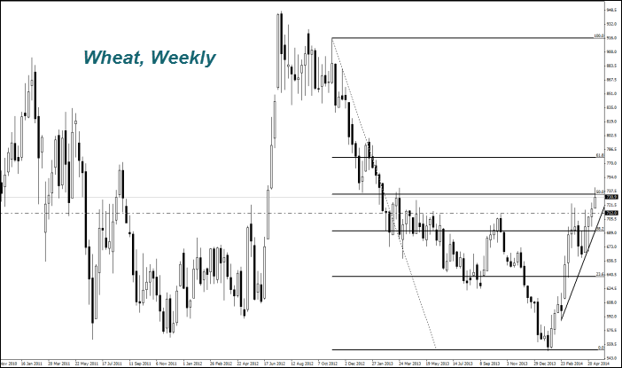 Стоимость пшеницы (Wheat) выросла до максимума за 11 месяцев. Потребители опасаются снижения урожая из-за возможной засухи в США. В южной части Великих Равнин температура поднялась до 32,2-37,8 градусов Цельсия. Вторым фактором стали беспорядки в украинском городе — торговом порте Одесса. 2 мая правительственные демонстранты сожгли заживо более сорока сторонников федерализации. Участники рынка не исключают перебоев с экспортными морскими поставками украинской пшеницы. Через Одессу осуществляется около 87% её экспорта. Остальные продовольственные фьючерсы подешевели из-за возможного замедления китайской экономики и снижения индекса PMI.