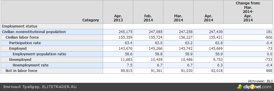 Собственно снижение уровня безработицы с 6,7% до 6,3% - это отражение судя по данным опроса негативных явлений, а именно перехода значительно части безработных в состав «невключаемых в рабочую силу», таковых набралось 733 тыс., при этом число занятых сократилось на 73 тыс. Мало того, в Not in labor force вошли и 181 тыс. новых участников считающихся экономически активным гражданским населением. Если представить, что такой категории как Not in labor force нет, при данных условиях уровень безработицы вырос бы в апреле до 6,9%.