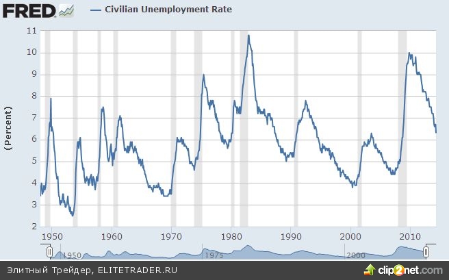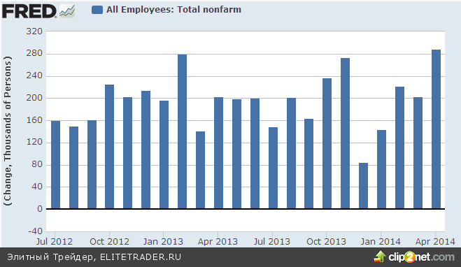 Что уж говорить о данных по рынку труда. Здесь также позитивная картина, которую вероятно, по меньшей мере, предполагали в ФРС. По крайней мере так выглядят голые цифры. Подробнее говоря, с оптимизмом можно смотреть на ту часть отчета, которая формируется исходя из данных платежных ведомостей. Число рабочих мест согласно ей выросло на 288 тыс., против прогнозных 210 тыс., что стало максимальным ростом с января 2012 года. Среднегодовой рост составляет 198 тыс., восстанавливаясь к желаемому регулятором уровню в 200 тыс. после слабых декабря-января. В календарном 2014 году средний темп прироста составляет сейчас 214 тыс.