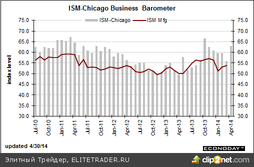 Как здесь не вспомнить о том, что на протяжении ноября-марта опережающий индикатор Chicago Business Barometer падал, но обнародованный в один день с данными по ВВП новый отчет по этому показателю за апрель указал на его рост с 55,9 до 63 пунктов, что оправдывает политику Федрезерва и подтверждает мнение о том, что слабые цифры первого квартала - это единовременный эффект от негативного влияния необычно суровых погодных условий прошедшей зимы.