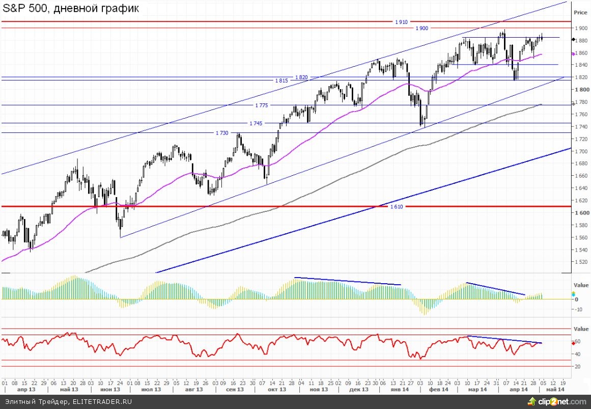 В данный момент индекс продолжает консолидироваться в паре шагов от исторических максимумов, которые были показаны на уровне 1897. Общая техническая картина продолжительный период остается неизменной.
