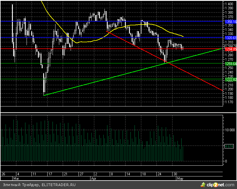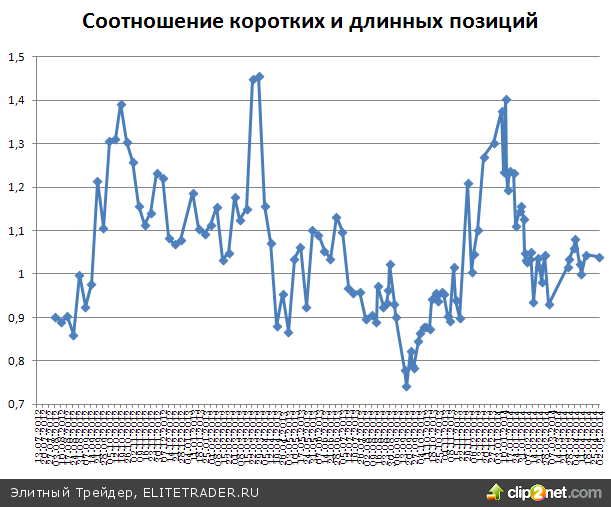 Обратив внимание на открытые юридическими лицами позиции по фьючерсу на индекс, можно заметить, что настроения крупных игроков за последнюю неделю практически не изменились и продолжают смотреть в сторону продаж. Соотношение коротких и длинных позиций по состоянию на 5 мая составляет 1,04 против 1,044 неделей ранее.