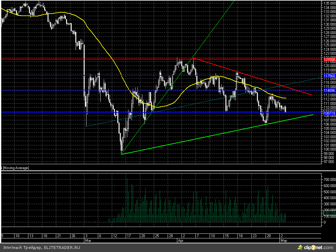 Фьючерс на индекс РТС сегодня торгуется на отрицательной территории, теряя более 0,5%. Драйвером для данной динамики является негативная статистика из Китая, а также продолжающаяся напряженность на Украине. Между тем RIM4 продолжает консолидироваться в районе 110000 и, похоже, готовится к новому сильному движению.