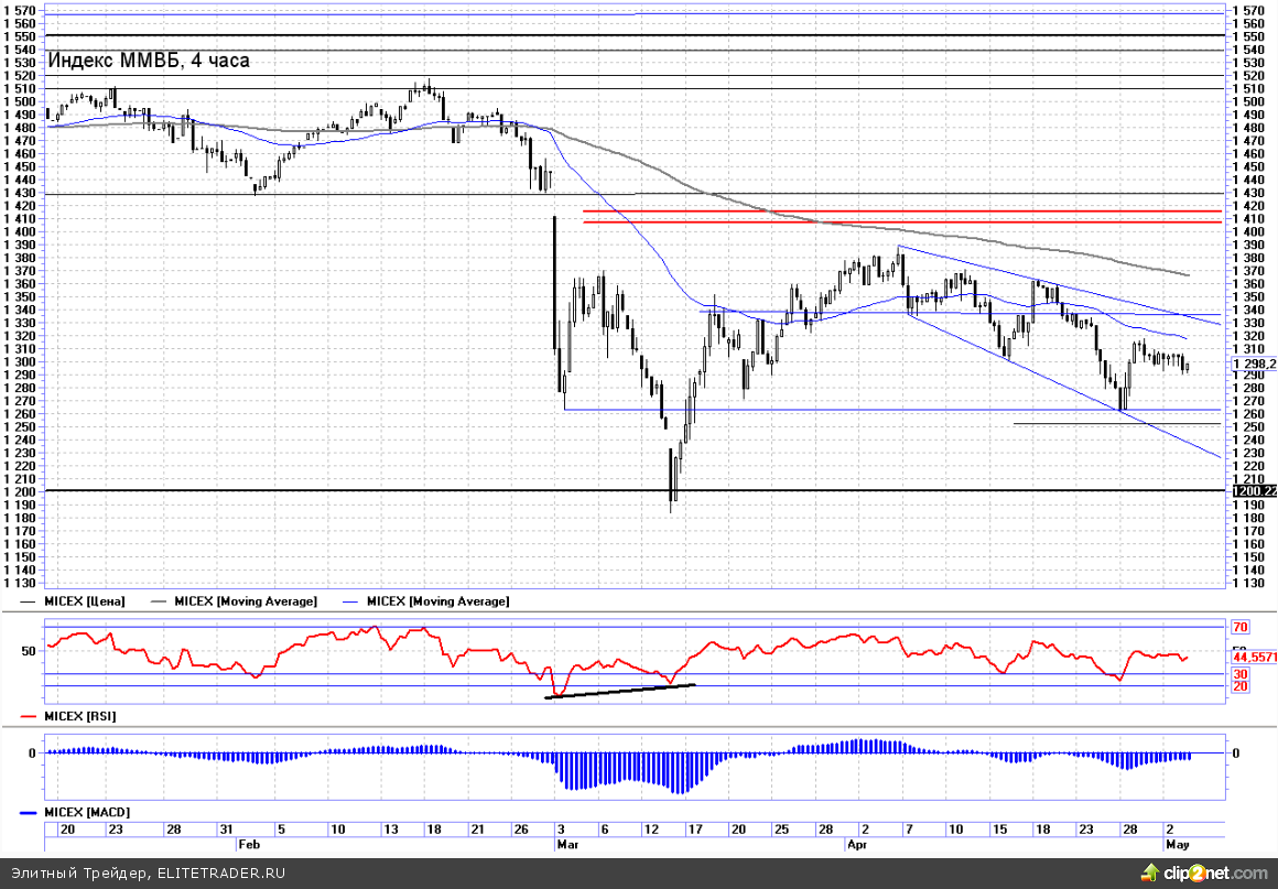 К сожалению, пока ничего нового в текущей формации на графике индекса ММВБ обнаружить не получается. Как и прежде отмечу, что пока мы продолжаем удерживать прибыльные длинные позиции, которые были сформированы по факту введения новых санкций в начале прошлой недели. В качестве ближайшего целевого сопротивления выделяется область 1330-1340. В то же время никаких существенных поддержек вплоть до зоны 1250-1260 не наблюдается. Предсказать дальнейшие движения в этом диапазоне достаточно сложно, так что стоит положиться на дальние стоп-заявки в районе минимумов прошлого понедельника. Вариант с пробоем обозначенной поддержки снова откроет дорогу к 1200. Рост выше 1340 вернет актуальность целей в районе 1405-1415. На сегодняшних торгах складывается благоприятный фон для возможного возврата ММВБ в район 1300 в начале сессии. Тем не менее, на безудержный рост в сложившейся обстановке вряд ли стоит надеяться. Украинский фактор, а точнее неопределенность, которая, скорее всего, сохранится до конца мая, по-прежнему выступает главной помехой для быков.