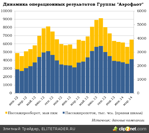 Вчера «Аэрофлот» опубликовал операционные результаты I квартала 2014 года. Авиакомпания перевезла 4,98 млн пассажиров, что на 15,2% больше, чем за аналогичный период прошлого года, в целом по группе пассажиропоток вырос на 12,2% до 6,89 млн человек, что превышает среднеотраслевой показатель (+9,7%). Пассажирооборот российских авиакомпаний за январь-март 2014 года вырос на 6,7% г/г.