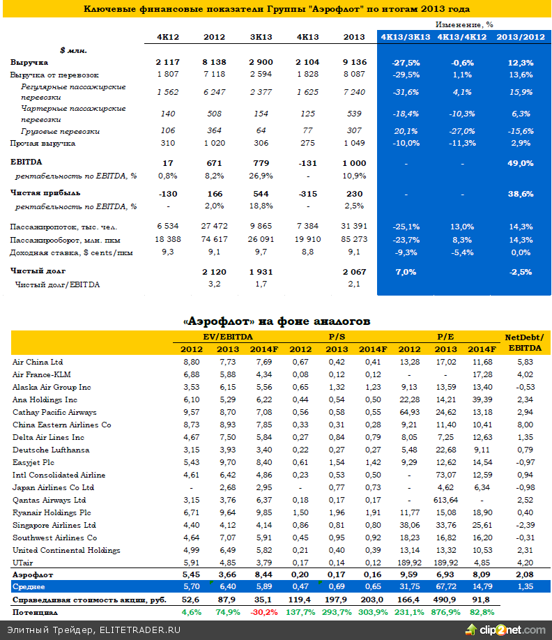 Здесь же отметим, что в комментариях к финансовой отчетности за 2013 год руководство «Аэрофлота» озвучило прогноз, согласно которому величина выручки в 2014 году останется на уровне 2013 года. Мы прогнозируем рост пассажиропотока в 2014 году на 9,0% до 34,22 млн человек, а значит, величина доходных ставок (yields) будет ниже, чем в предыдущие периоды. Кроме того, менеджмент компании заявил, что доходная ставка в рублевом эквиваленте в 2014 году сохранится на уровне 2013 года, что, с учетом ослабления рубля, негативно скажется на выраженной в долларах выручке. Снижение именно этого показателя в конце 2013 года привело к тому, что многие инвестдома понизили свою оценку стоимости акций компании.