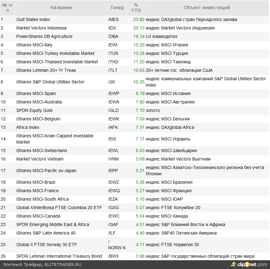 На втором месте нашего рейтинга разместился фонд с привязкой к индонезийскому рынку акций, который по итогам марта занимал первую строчку. Несмотря на то, что его потеснил инструмент Gulf States, индонезийский рынок за апрель также показал положительный результат - ожидания итогов выборов в стране подталкивали рынок вверх. Так или иначе, итоги выборов были в какой-то степени неожиданными и разочаровывающими для многих, и теперь страну ждет неопределенность с фронтраннером на пост президента. На наш взгляд, это не позволит индонезийскому ETF в ближайшие месяцы приносить положительную доходность.