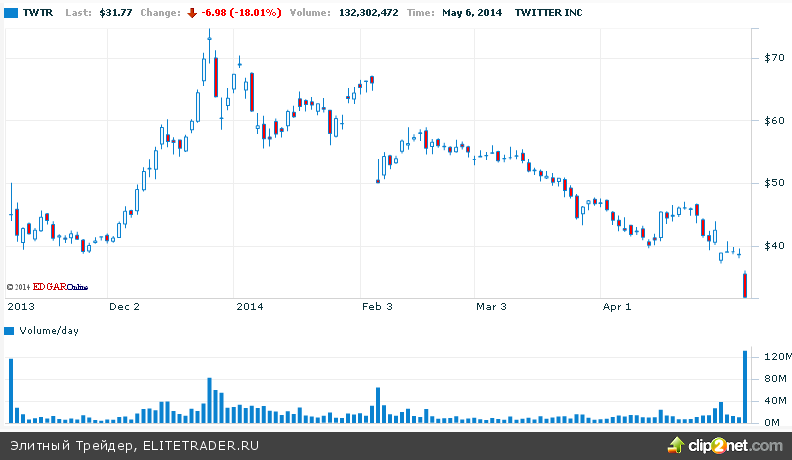 Вслед за акциями Twitter, не входящими, к слову сказать, в SnP500, потянулись продажи бумаг других интернет компаний: Facebook (-4,39%), Netflix (-5,28%), Amazon.com (-4,09%).