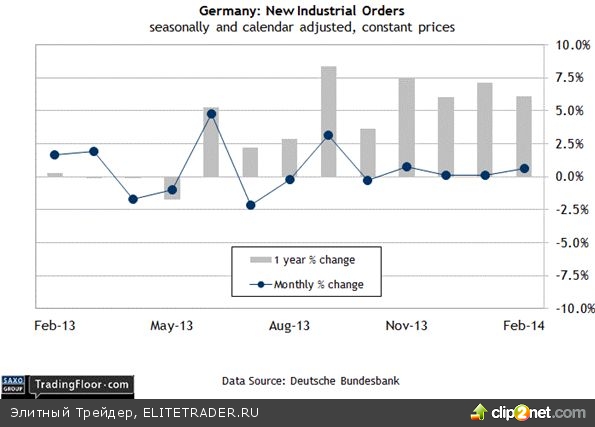 Новые промышленные заказы в Германии (06.00 GMT): Европейская комиссия прогнозирует, что «экономика Германии наберет темпы роста благодаря внутреннему спросу». На прошлой неделе был опубликован весенний выпуск отчета Еврокомиссии за этот год, в котором она дает оценку росту ВВП крупнейшей экономики Европы на уровне 1,8% в 2014 году и на уровне 2% в 2015-м, что существенно превосходит невысокий результат прошлого года на отметке 0,4%. Ожидается, что главным рычагом подъема станут капиталовложения предприятий. Согласно прогнозу Еврокомиссии, «тенденция к росту отечественных заказов на средства производства и постоянное расширение инвестиционных планов компаний на фоне снижения уровня неопределенности и благоприятных условий финансирования указывают на дальнейший рост инвестиций в оборудование».