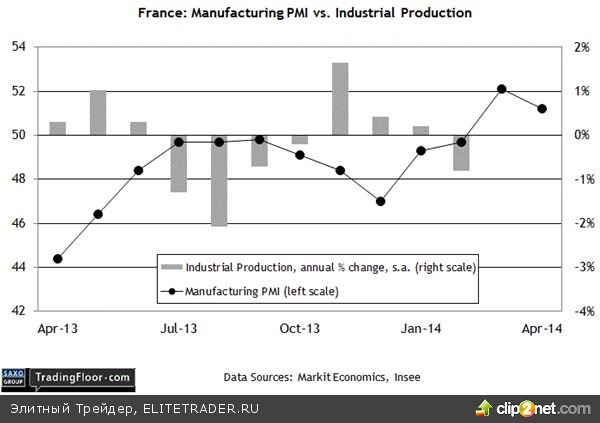 Промышленное производство во Франции (06.45 GMT): Согласно самым последним результатам опросов в деловом секторе от Markit Economics, экономика Франции держится на плаву с небольшим перевесом сил в свою пользу, однако угроза возникновения проблем во второй по величине экономике Европы находится буквально на поверхности. Несмотря на то, что оба индекса PMI — в производственном секторе и секторе услуг — остаются выше нейтральной отметки 50, имеющаяся на текущий момент статистика не дает уверенности в том, что рост продолжится и, уж тем более, наберет обороты. В обоих секторах в апреле индекс PMI приблизился к нейтральному уровню. Общий тренд отражен в композитном индексе компании Markit для Франции, который пустился до двухмесячного минимума на отметке 50,6, что означает практически полную остановку экономической активности.