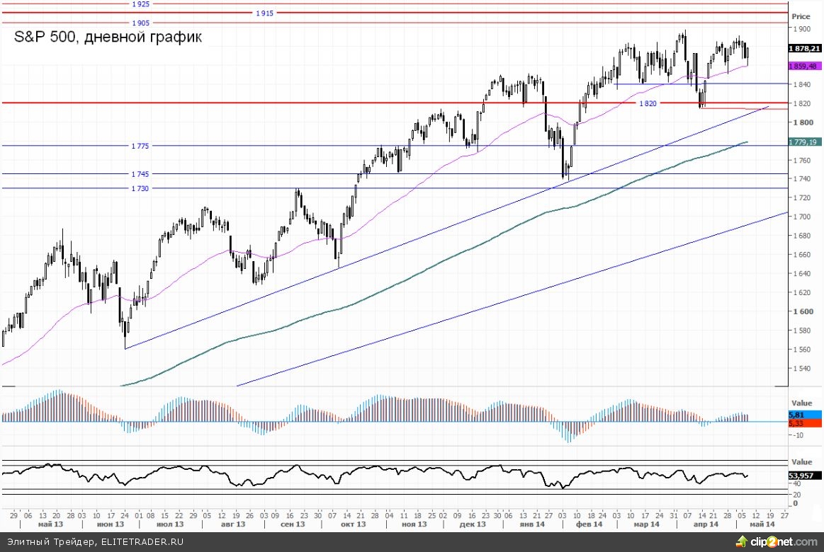 В предыдущих обзорах мы уже говорили, что в качестве ближайших более-менее значимых уровней сопротивления выделяются отметки 1905 и 1915. В данный момент индекс находится в рамках восходящего тренда, так что достижения обозначенных отметок вполне оправданно. К сожалению, сейчас нет четкой уверенности о том, в какую сторону раскроется текущий боковик. Вероятность бычьего сценария выше в силу структуры существующего тренда.
