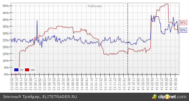 В свою очередь, подразумеваемая волатильность RIM4 находится ниже исторической на целых 6 пунктов. Данный момент говорит о перепроданности опционов, которая обычно сглаживается путем снижения.