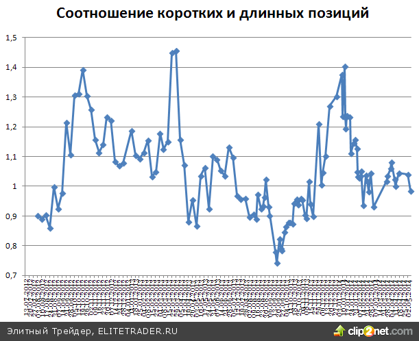 Обратив внимание на открытые юридическими лицами позиции по фьючерсу на индекс, можно заметить, что настроения крупных игроков за последние несколько дней заметно улучшились и из негативных перешли в позитивное состояние. Соотношение коротких и длинных позиций теперь составляет 0,985 против 1,04 тремя днями ранее. Поэтому сигнал умеренно-положительный.