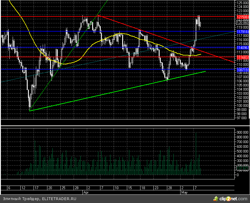 Между тем открытые опционные позиции по RIM4 со сроком исполнения 15.06.14 сейчас дают умеренный сигнал на продажу. На отметке 120000 можно увидеть огромное количество опционов колл, которые выступают сильным сопротивлением. При этом большое количество опционов пут располагается лишь в районе 110000.