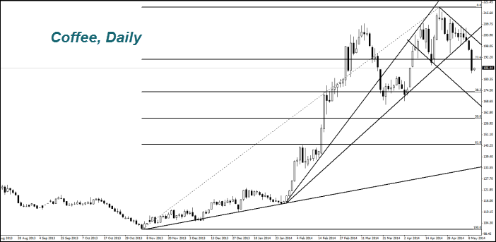 Как мы и предполагали в предыдущих обзорах, котировки кофе (Coffee) начали нисходящую коррекцию. Вьетнамские производители приступили к реализации запасов прошлого урожая. Сейчас запасы уже сократились до 390 тыс. тонн, что на четверть ниже среднего уровня за 5 лет. Таким образом значимость данного фактора существенно уменьшилась. При этом на стоимость кофе оказывает позитивное влияние пересмотр прогноза его урожая в Бразилии. Инвесторы полагают, что влияние засухи было преуменьшено. По данным некоммерческого агентства Fundacao Procafe, урожай кофе в Бразилии может составить всего 40,1-43,3 млн. мешков (60 кг). Это гораздо меньше правительственного прогноза 49 млн. мешков и может поддержать котировки в будущем, если он оправдается.