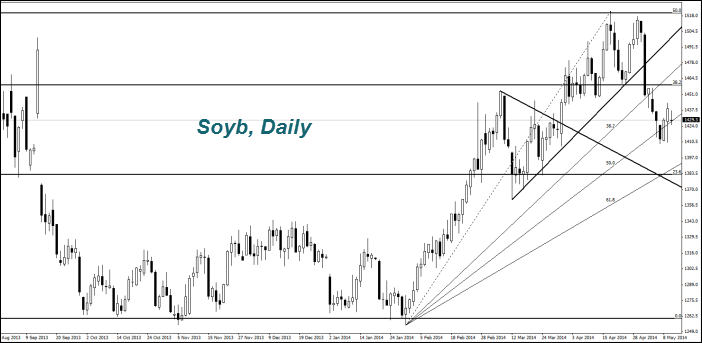 Котировки сои (Soyb) выросли после опубликования прогноза Министерства сельского хозяйства США (USDA). Ожидается, что её запасы в США в сезоне 2013/2014 составят 130 млн. бушелей. Это на 4 млн. меньше предварительной оценки участников рынка. Прогноз мировых запасов оказался на 2,79 млрд. бушелей меньше ожиданий рынка и составил 66,98 млрд. бушелей. Прогноз американских запасов в сезоне 2014/2015 увеличился до 330 млн. бушелей. Однако увеличение произойдёт лишь в сентябре, когда начнётся уборка нового урожая. Поэтому данная позитивная оценка пока не повлияла на текущие котировки.