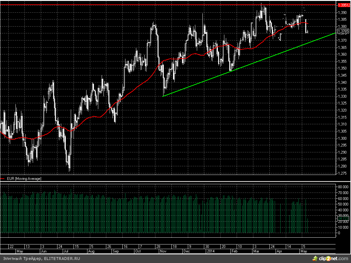 В свою очередь европейская валюта после заседания ЕЦБ ожидаемо отскочила от отметки 1,395 и уже практически добралась до первой цели снижения в районе 1,375. Здесь проходит краткосрочная трендовая линия, пробой которой может ускорить снижение, но вот драйверов для этого пока маловато. Единственным таким катализатором остаются высказывания Марио Драги о возможности смягчения денежно-кредитной политики уже на следующем заседании в случае роста рисков дефляции, а также продолжения укрепления валюты региона. Поэтому сейчас желательно повременить с активными действиями по данной валютной паре, а продавать начинать лишь в случае пробоя отметки 1,375.
