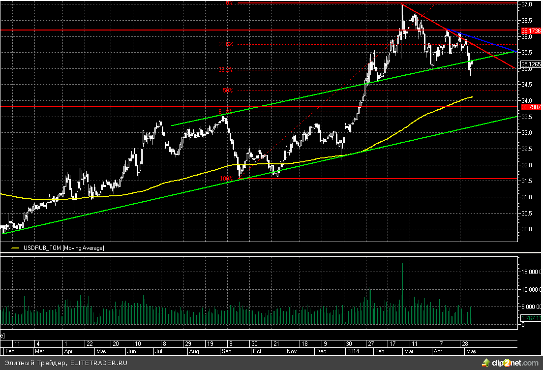 На этом фоне доллар добрался до отметки 35,2, где у него находится очень сильное сопротивление в паре с рублем. В случае закрепления выше данной отметки следующей целью станет 35,5. Драйвером при этом могут выступить очередные негативные высказывания и санкции в сторону России. Впрочем, исключать возможность роста рубля в ближайшем будущем явно не стоит, ведь цены на нефть и металлы демонстрируют сегодня хороший рост, ЦБ продолжает продавать иностранную валюту, а геополитические риски во многом уже в цене российской валюты. Поэтому в текущей ситуации можно аккуратно продавать данную валютную пару от уровня 35,2 с коротким стопом из-за существенных рисков.