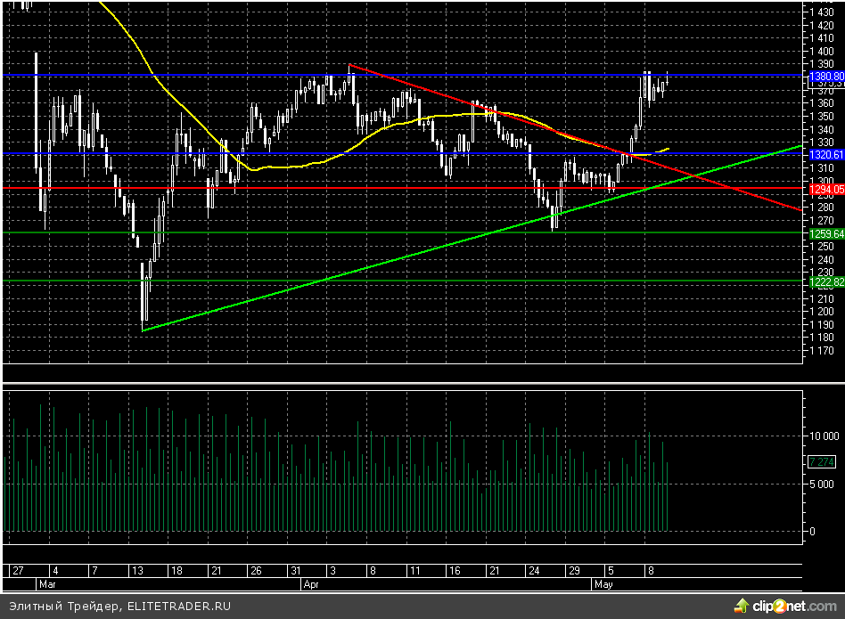 Обратив внимание на открытые юридическими лицами позиции по фьючерсу на индекс, можно заметить, что настроения крупных игроков продолжают улучшаться и уже уверенно смотрят на покупку. Соотношение коротких и длинных позиций по состоянию на 8 мая составляет 0,955 против 0,98 днем ранее.