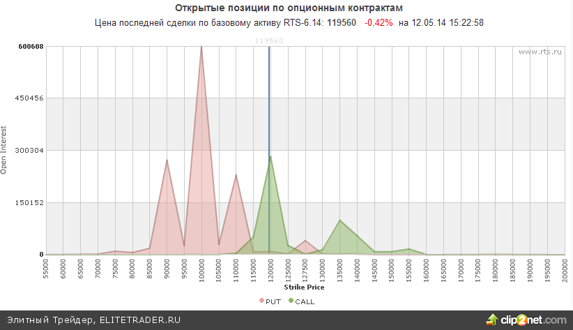 Между тем открытые опционные позиции по RIM4 со сроком исполнения 15.06.14 сейчас смотрят на снижение. На отметке 120000 можно увидеть большое количество опционов колл, которые выступают как достаточно сильное сопротивление. При этом эквивалентное количество открытых опционов пут расположено лишь в районе 110000.