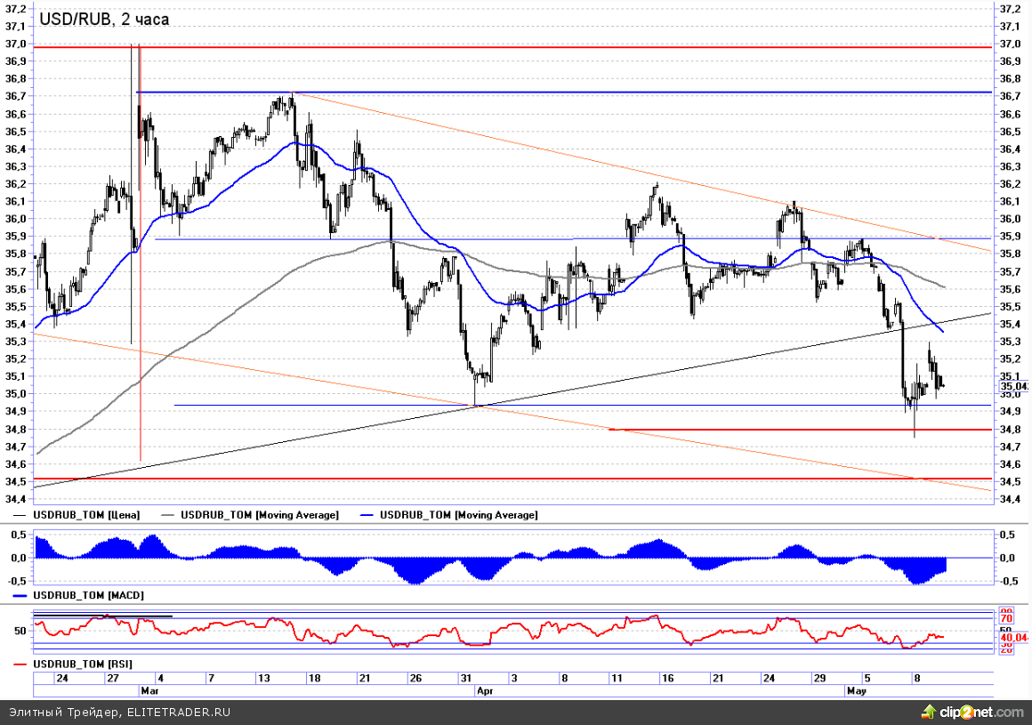 Пара доллар/рубль после заметного отскока от целевой поддержки 34,80 снова начала постепенно снижаться и готова вот-вот снова протестировать обозначенный рубеж. В предыдущих обзорах мы уже упоминали, что уровень 34,80 выступает в качестве той точки, спуск ниже которой откроет дорогу к финальной фазе укрепления рубля в рамках большой среднесрочной коррекции. Целью в таком случае станет область 34,30-34,50, откуда долгосрочная покупка доллара снова будет выглядеть очень привлекательной.