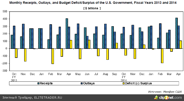 В то же время традиционно профицитный апрель в связи с налоговыми выплатами в этом году принес $414 млрд. доходов, против $407 млрд. годом ранее.