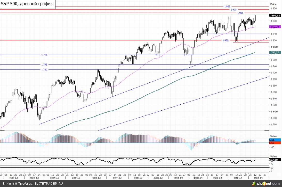 Нужно сказать, что вчерашний рост проходил в отсутствии важных событий. Сезон отчетов почти завершился и на текущей неделе ожидаем лишь финрезультаты ритейлеров включая Wal-Mart, и также отчет Cisco Systems. Важной статистики помимо данных по балансу бюджета за апрель в понедельник также опубликовано не было.