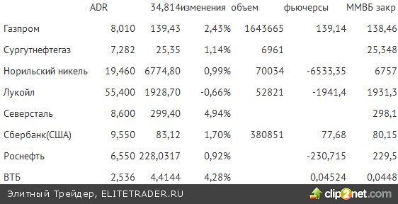 Российские ADR в Нью-Йорке 12.05 (индекс Блумберга) выросли +0.55%. Лидировали в росте Газпром (+2.43%), Сургутпреф (+2.05%), Сбербанк(+1.7%), Сургутоб (+1.14%), Норникель (+0.99%)… Упали Русгидро (-1.86%), Мечел (-0.93%), Лукойл (-0.66%). Market Vector Russia ETF вырос на +0.96%