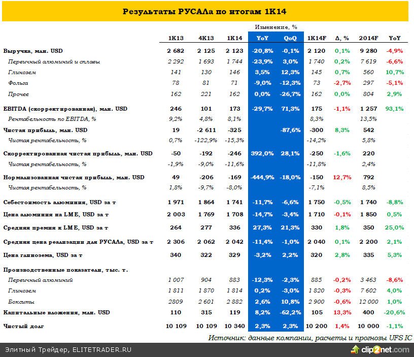 РУСАЛ опубликовал финансовые результаты по МСФО за 1К14. На фоне сокращения выпуска и достижения ценами на алюминий на мировом рынке минимумов с 2009 года, результаты, тем не менее, выглядят довольно сильными.