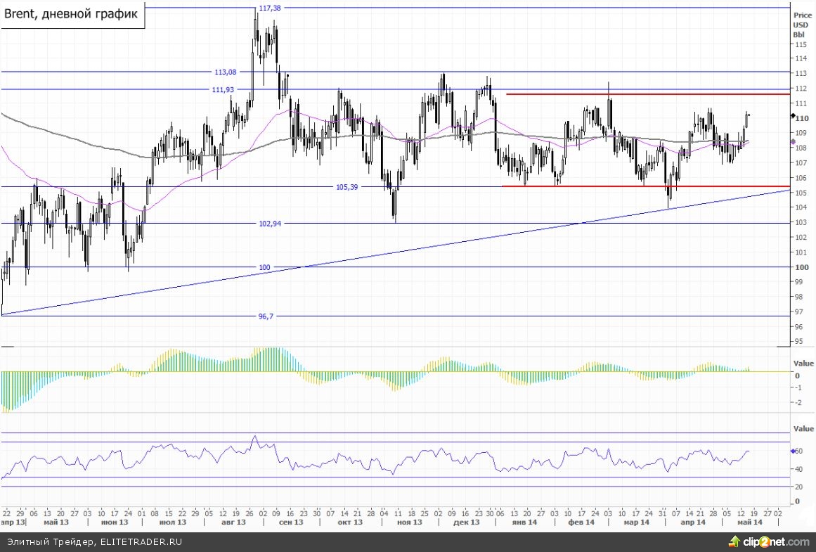 Позитивным драйвером для российского рынка акций является ситуация на рынке нефти. В ближайшей перспективе котировки Brent могут снова вплотную подобраться к верхней границе бокового коридора, в пределах которого нефть консолидируется весь 2014 год. Сверху в качестве ключевой зоны торможения выступает область $111-112 за баррель марки Brent. В случае преодоления этих рубежей далее нас может ждать мощный бычий импульс наверх в район $115,5-117.