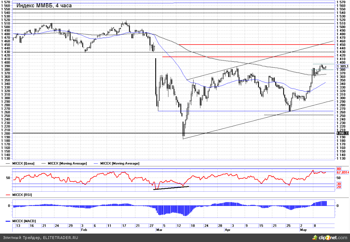 В среду на российском рынке была сессия консолидации, который собирался стать днем плоской коррекции, однако к концу дня индекс ММВБ снова вышел на положительную территорию. В итоге мы уже шесть сессий подряд наблюдаем закрытие в плюсе. Наш ранее озвученный позитивный взгляд на рынок пока полностью оправдывается. Никаких панических распродаж уже давно не наблюдается. Если даже на рынке и пройдет некоторое снижение (не вызванное внешними шоками типа санкций или обвал Америки), то его обязательно снова выкупят. Индекс ММВБ в данный момент продолжает находиться в вязкой зоне торможения 1380-1395. С точки зрения техники пока все еще остается актуальной расчетная цель в районе 1415п. Если не будут мешать внешний фон и хотя бы останется нейтральным, то обозначенные рубежи наверняка будут достигнуты. Более того, Сохраняю в голове среднесрочный сценарий, в рамках которого котировки индекса могут допрыгнуть до важных сопротивлений на 1440-1450.