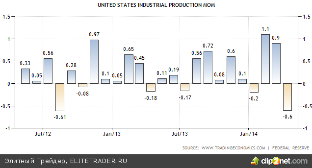 И драйвером для коррекции вполне может стать сегодняшняя макроэкономическая статистика. В частности ВВП еврозоны вырос в первом квартале всего на 0,2% при средних ожиданиях на уровне 0,5%, а промышленное производство США упало на 0,6%, что является максимальным снижением за последние 1,5 года.