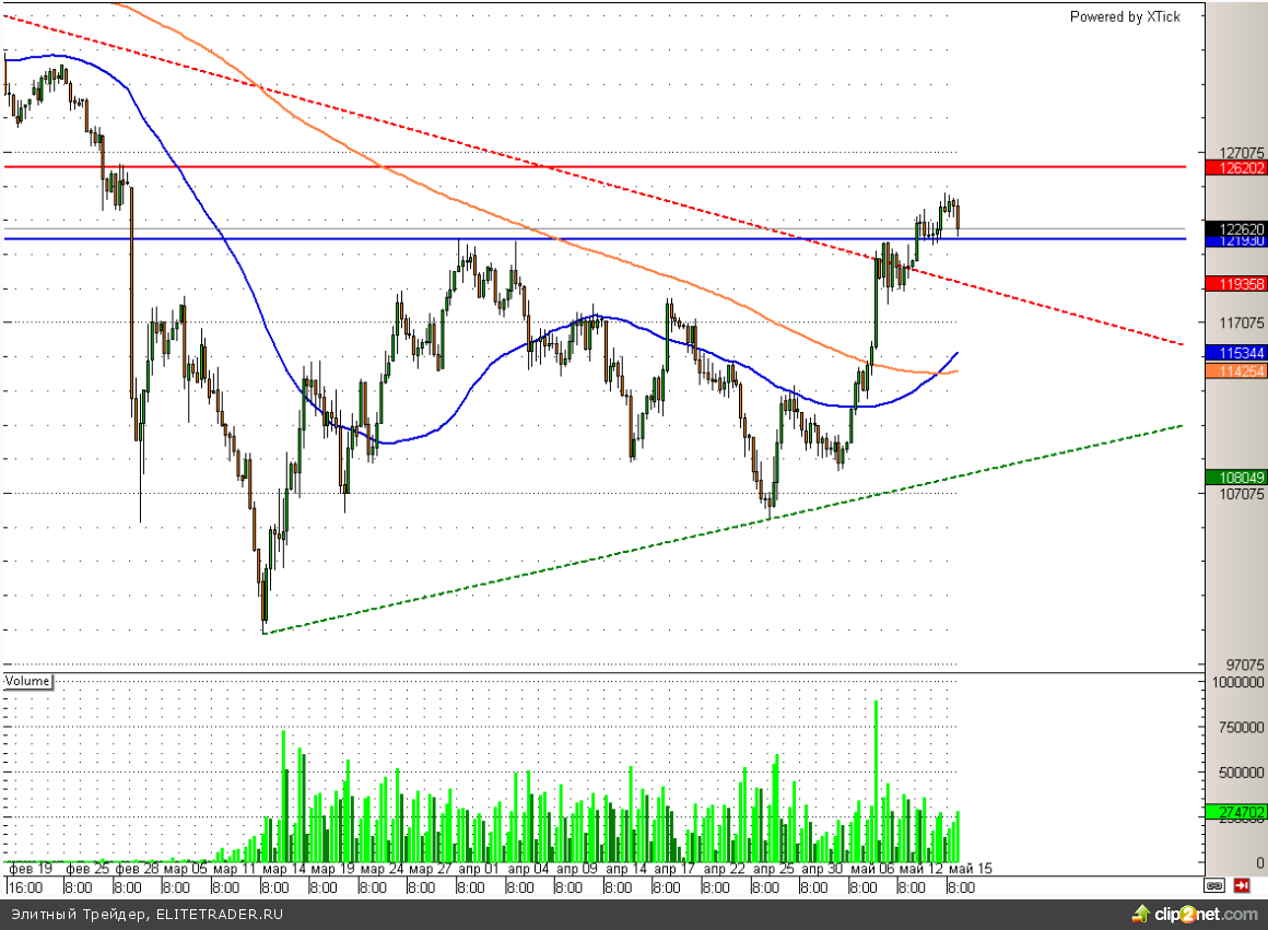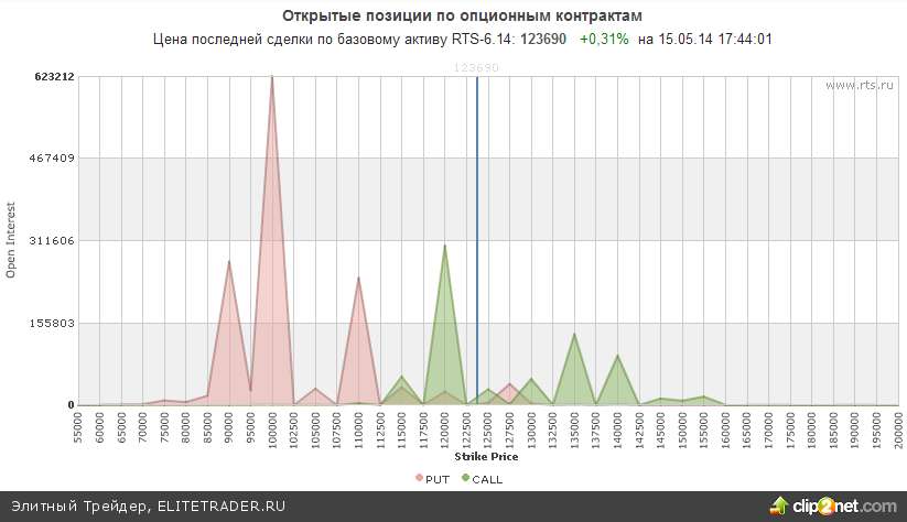 Между тем открытые опционные позиции по RIM4 со сроком исполнения 15.06.14 сейчас смотрят преимущественно на покупку. Крупное скопление опционов колл можно заметить лишь в районе 120000, а эту отметку мы недавно преодолели. Поэтому она стала уже скорее поддержкой, чем сопротивлением.