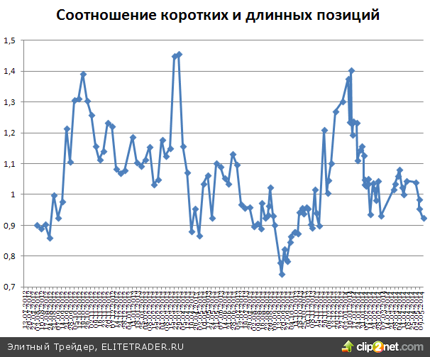 Обратив внимание на открытые юридическими лицами позиции по фьючерсу на индекс, можно заметить, что настроения крупных игроков с конца прошлой недели стали еще более «медвежьими». Соотношение коротких и длинных позиций теперь составляет 0,924 против 0,955 четырьмя днями ранее.