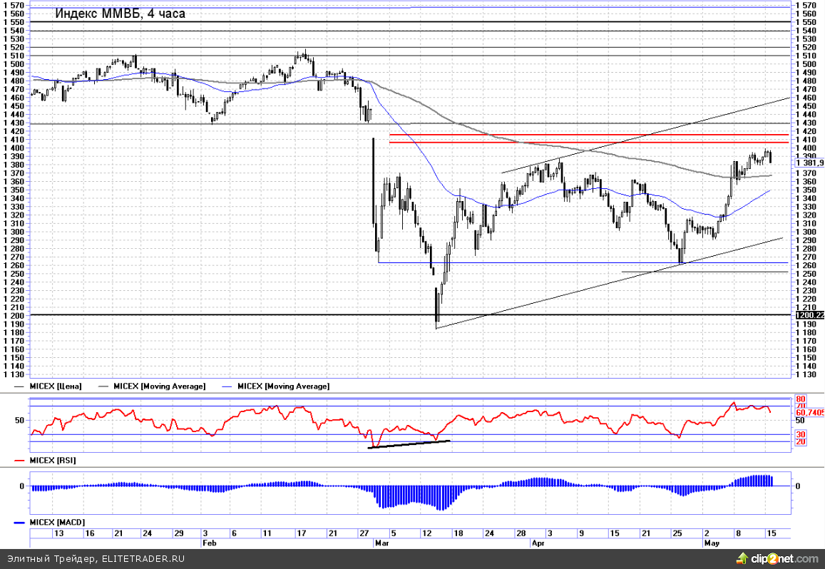 После шести подряд сессий роста вчера индекс ММВБ закрывался на отрицательной территории. Потери оказались незначительными, никаких важных поддержек пробито не было. После позитивного открытия и тестирования круглой отметки 1400 внешний фон начал постепенно ухудшаться, что заставило активизироваться продавцов и на нашем рынке. Никакой паники пока не наблюдается, падение носит локальный коррекционный характер. Потенциал снижения полностью еще не исчерпан. В то же время от целей в районе 1415 пока не отказываемся.