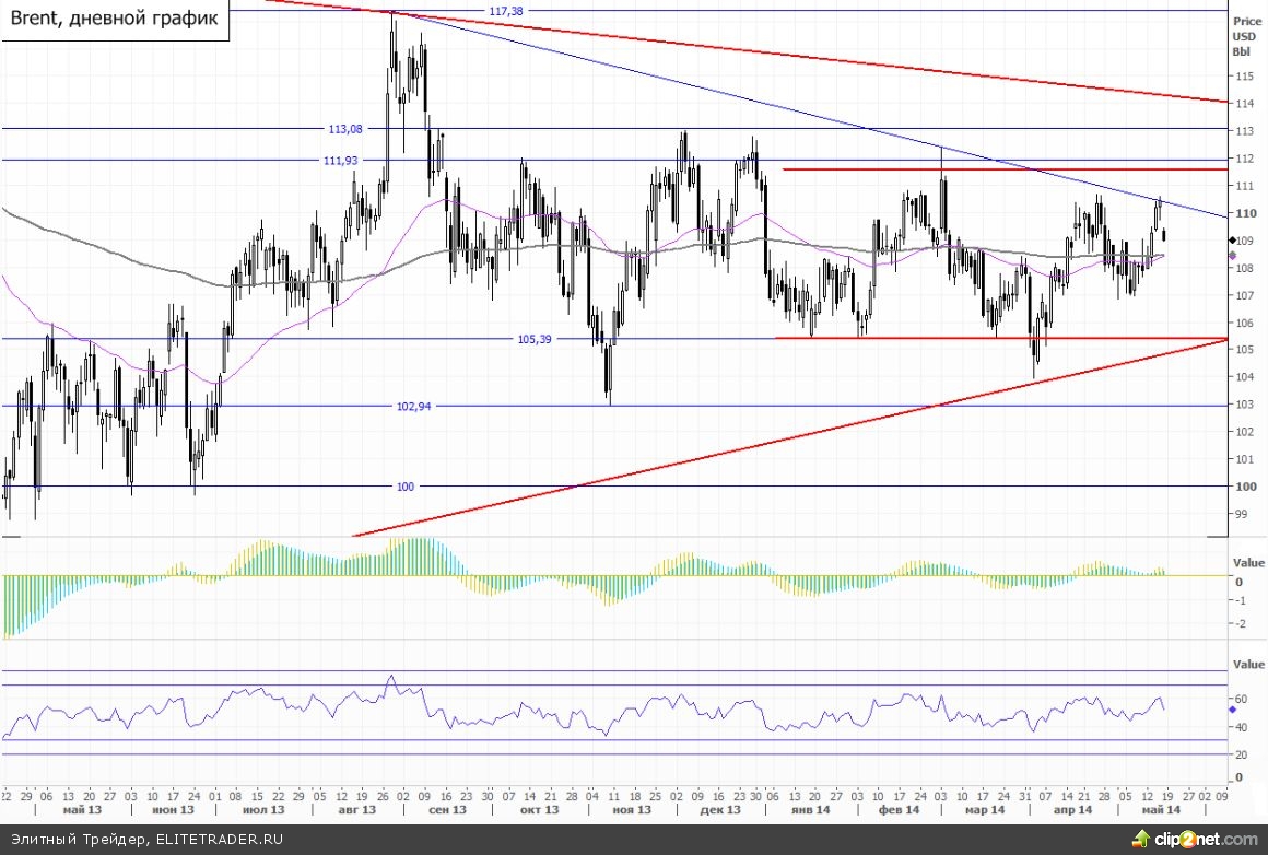 Общая техническая картина на графиках североморской смеси Brent по-прежнему остается стабильной. На протяжении всего 2014 года котировки нефти болтаются в рамках бокового коридора, выйти за пределы которого никак не удается. Ни о каком направленном тренде сейчас речи не идет. Говорим лишь о локальной восходящей волне. Сверху в качестве ключевой зоны торможения выступает область $111-112 за баррель марки Brent. В случае пробоя этих рубежей, которые сегодня выступают в качестве верхней границы продолжительного бокового коридора, далее нас может ждать мощный бычий рывок наверх в район $115,5-117. Ну а о каких-либо перспективах серьезного трендового снижения мы будем говорить лишь в случае повторного спуска цены Brent под нижнюю границу коридора на $105.