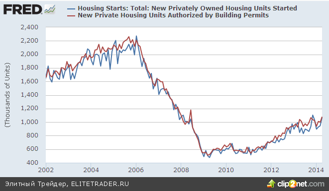 В отличие от позитивной динамики многих показателей американской экономики, испытавших при этом некоторое давление негативных погодных условий прошлой зимы, рынок жилья помимо данного фактора последние месяцы находился под давлением высоких ипотечных ставок и роста цен на недвижимость, но как видим, и здесь ситуация улучшается. Правда нужно сказать, что темпы роста строительства односемейных домов были весьма скромные, а в целом с января по апрель 2014 года рост составляет 2%, против почти 26% в аналогичном периоде 2013 года.